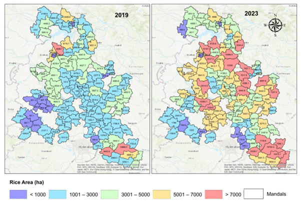 Mitigating the environmental impact of agricultural practices, particularly intensive rice farming, is critical in the face of climate change. This study focuses on mapping rice residue burn areas and their dates while estimating the greenhouse gas (GHG) emissions associated with residue burning and rice cultivation. By using Sentinel-2 satellite imagery, machine learning algorithms, and ground truth data, we analyzed changes in rice cultivation patterns before and after the Kaleshwaram intervention. The Near-Infrared Region (NIR) band was instrumental in accurately identifying residue burn areas and pinpointing burn dates, enabling timely alerts for decision-makers to act. Detailed quantifications of CO2, CH4, and N2O emissions from crop residue burning, alongside methane emissions from rice cultivation, highlight the significant contribution of these practices to overall GHG emissions. Key findings reveal a significant 82.1% increase in rice cultivation area from 2018–2019 to 2022–2023, accompanied by a worrying rise in residue burning, with some regions experiencing up to a 276% increase in burn areas. This research not only reveals the dual challenges of residue burning and GHG emissions but also emphasizes the importance of integrating precise burn date monitoring with emission data. The findings provide a strong foundation for implementing sustainable crop residue management strategies and developing informed policies to mitigate the adverse environmental effects of rice farming. read more ...